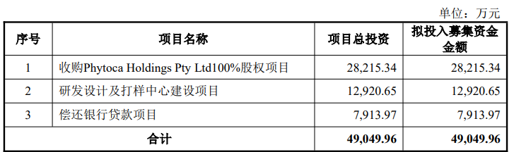 根据公司今年3月份披露的定增预案,本次定增募集资金总额约为4.9亿元,扣除发行费用后的募集资金净额拟用于收购Phytoca Holdings Pty Ltd(以下简称Phytoca)100%股权、研发设计及打样中心建设项目和偿还银行贷款项目。