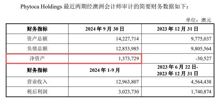 值得注意的是,截至2024年第三季度末,Phytoca净资产约137.37万澳元(约合人民币628.8万元)。
